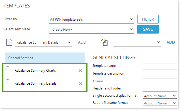 You build PDF reports by adding individual report sections together. In Tamarac Reporting, these sections can be reports like the Holdings or Asset Allocation reports. With this release, you'll see two new report sections for creating PDF reports with Rebalance Summary data: Rebalance Summary Charts and Rebalance Summary Details.