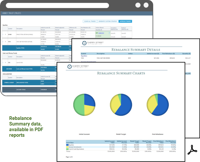 The Rebalance Summary is a highly used visual tool that lets you see clients' trade recommendations in the context of the models and available cash in their accounts. Now this powerful tool is available as a PDF report. With new PDF reporting, you can show trade recommendations and cash information for a single account or group, all in an easy-to-read format that fits your firm's branding and the needs of your clients.
