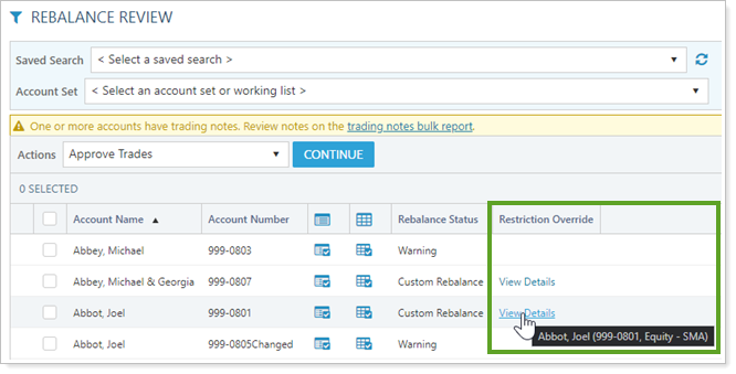 New Restriction Override column.The Restriction Override column is now available on many pages, including the Trade List, Rebalance Review, and Trade Review. This column is available to all users, regardless of whether you enable the additional restriction overrides approval level or not.