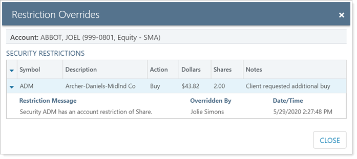 During the trading workflow, your firm may require a trader to document a reason for a trade in restricted securities. One enhancement added during this release is a restriction override warning and documentation feature. After creating a trade that violated a security restriction as a quick trade or custom strategy, the trader will see this detailed summary of the trade and its restricted security: