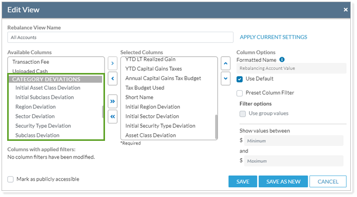 This enhancement will allow you to quickly search for accounts with deviations out of tolerance as targets for rebalancing.
