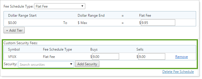 If your custodian charges different transaction fees for buys and sells and you use a flat fee schedule, you can now set the transaction fee for buys and sells at the security level. To set the transaction fees for securities, on the Setup menu, click Fee Schedules. You can specify the buy and sell transaction fees under Custom Security Fees for the Custodian Transaction Fee fee schedule.
