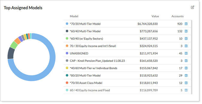 Models & CategoriesThis customizable widget allows you to show key information about your models, such as top assigned models or allocation to top asset classes — what displays is up to you. While you can show the default value of Top Assigned Models, you can also show your categories such as asset class, market cap, region, sector, security type, and subsector data, depending on your needs. You can also add optional columns to the table, change the number of results shown, and change the title of the report as needed.