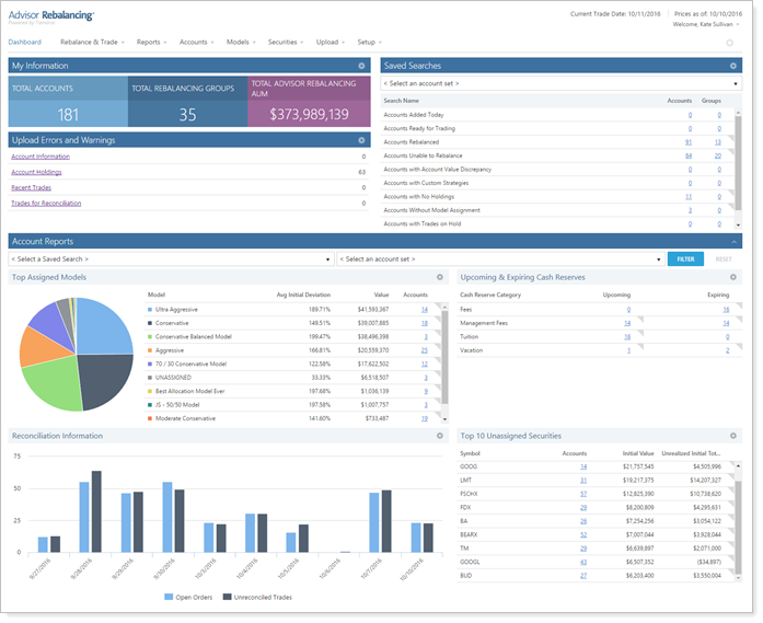 We're thrilled to unveil our latest innovation — the Advisor Rebalancing dashboard. The design is sleeker and more intuitive, helping you make better business decisions by providing quick access to details about more key business areas than ever before. This new dashboard displays a variety of actionable information — from upcoming cash reserves to reconciliation information — at your fingertips as soon as you sign in. The well-organized layout provides quick and accurate snapshots of your rebalancing data, easy access to your model and account information, and easy access to reports, all from a single page.