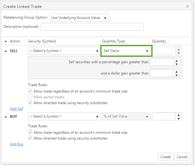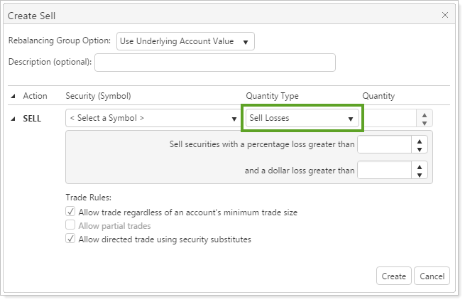 These new quantity types don't require that you to change any system or account settings to accommodate an on-the-fly harvest of losses or gains. Instead, you can specify a threshold of loss or gain and, if the criteria are met, Advisor Rebalancing will generate the trade.