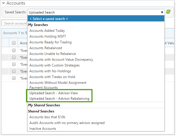 If you upload a search with accounts that are exclusive to one product, your search will still appear in both Advisor View and Advisor Rebalancing, but any unavailable accounts will not appear.