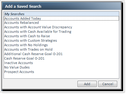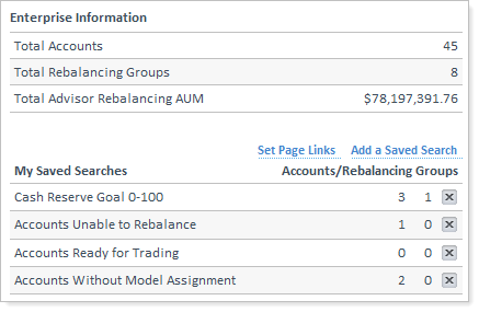 The first time you sign in to Advisor Rebalancing after the update, you'll see that the dashboard has a new look. With this release, you can add your saved searches to the dashboard. This new feature will make it easy to quickly find information that is relevant to your firm.