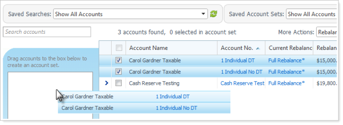 Select the check boxes next to the accounts you want to add to the account set, and drag the accounts into the Drag accounts to the box below to create an account set box.