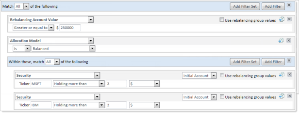 Filter sets.Now you can add filter sets to your saved searches. Filter sets are essentially a search within a search - for example, you can use a filter set to find accounts assigned to a particular Allocation or Security Level model and have an account value of at least $250K and is holding either MSFT or IBM.