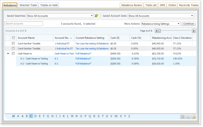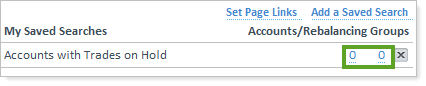 Let's say you set up a saved search for accounts with trades on hold. When you click the saved search, Advisor Rebalancing can take you to the Rebalance Review page.