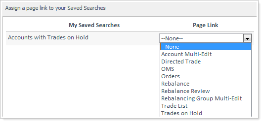 - Use the Page Link list to specify where Advisor Rebalancing should take you when you click the Saved Search, and then click OK.