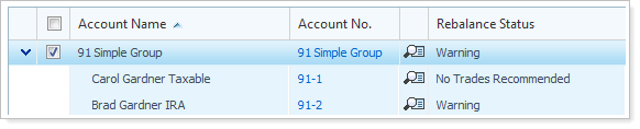For example, let's say you have a rebalancing group with three underlying accounts, each worth $100K. If I did not select this check box, Advisor Rebalancing would not find any of the underlying accounts or the rebalancing group. However, if you selected this check box, Advisor Rebalancing would look at the group's value of $300K and return all of the underlying accounts and the group.
