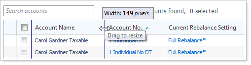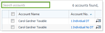 To search for an account, type the criteria you want to search for in the Search accounts box, and then press ENTER. Advisor Rebalancing will return results where the account name meets the criteria you entered.
