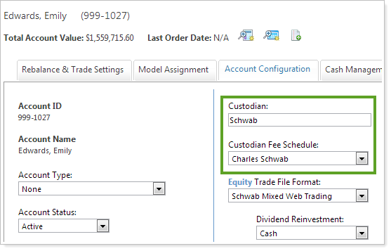 In this release, we've added a Custodian field to the Account Configuration page of Advisor Rebalancing. This field is automatically completed with the custodian that's set in Advisor View. As a result of this change, we renamed the previous Custodian field to Custodian Fee Schedule.