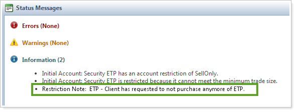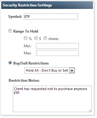 When adding a security restriction for an account, you now have the option to add a note for why you added the security restriction - for example, let's say your client wants to prevent the purchase of Energy Transfer Partners; you can add a note for the restriction and it will appear on the on the Rebalance Summary, Trade Review, and Trade Summary when you try to purchase ETP.