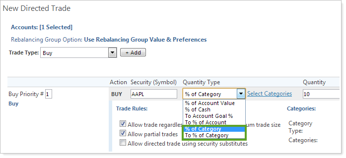 The % of Category trade type functions as a % of Account directed trade based on a factor of what is currently held in the selected categories.