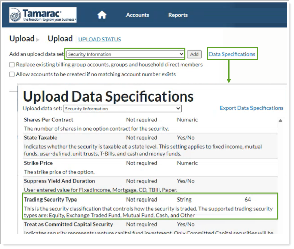 - Optionally, you can specify Trading Security Type when you create new securities in your Tamarac site manually or by bulk upload. When adding a security with the Security Information bulk upload, include the Trading Security Type data point.