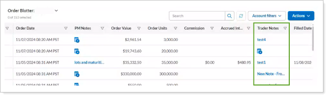 In Order Blotter, a trader adds a new trader note to a bond order as before and the order’s most recent note displays in the Trader Note column. When a trader selects a note’s link, they can now: