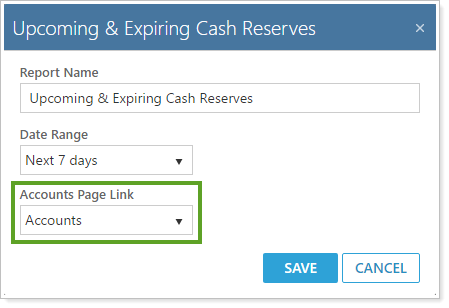 Once set, links will display on the widget, allowing you to jump directly to your desired page for further action. Once there, the page you chose will be filtered by a custom account set based on the results in the widget.