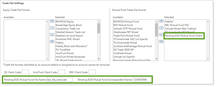 To accompany this trade file, we've also included two new fields on the System Settings page. Contact Pershing to find out more about how to configure the Pershing EOD Mutual Fund File Name and Pershing EOD Mutual Fund Correspondent Name fields.