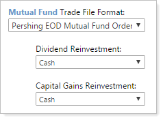 We've added a new Pershing trade file called Pershing EOD Mutual Fund Orders, which offers an additional option for trading mutual funds with Pershing. When you assign this trade file to an account in Account Settings, you can specify if you'd like to handle Dividend Reinvestment and Capital Gains Reinvestment in either Cash or Shares.