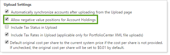 To enable negative value positions in client accounts, we added the Allow negative value positions for Account Holdings option in the Upload Settings section of the System Settings page.