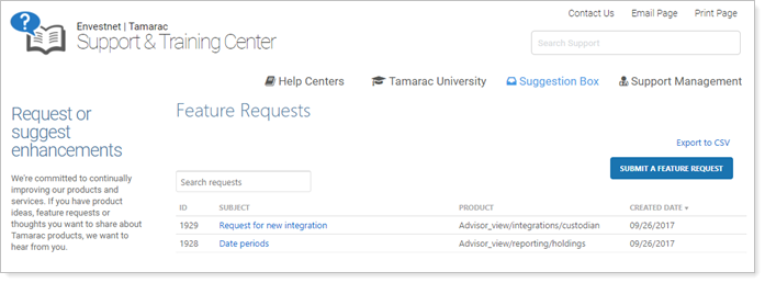 You can access the Suggestion Box by clicking the Suggestion Box link in the Support & Training Center.