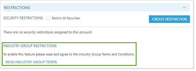 In order to use the Industry Group Restrictions feature in Tamarac Trading, you will need to accept one-time terms and conditions before proceeding, even if you've used industry group restrictions in the past. After you've accepted these terms and conditions once, you can continue to use this feature as you normally would.