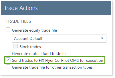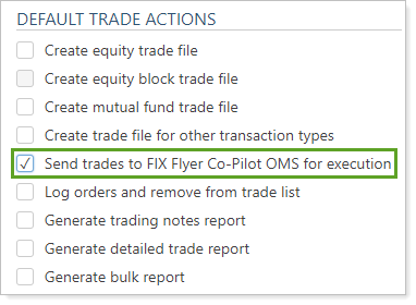 When selected, this option will enable the Send trades to FIX Flyer Co-Pilot OMS for execution option by default on the Trade Actions list when you generate trades.
