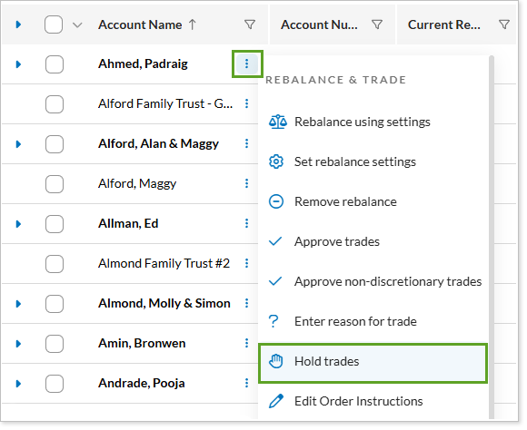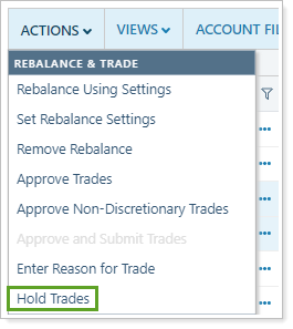 Rebalance page Actions list.Select accounts and use Hold Trades in the Actions list.