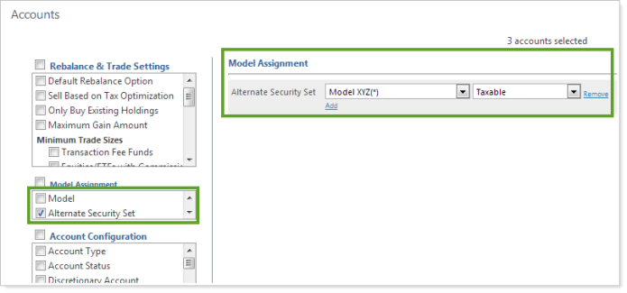 Adjusting the Alternate Security Set for your accounts is much easier and more streamlined. Before this release, Advisor Rebalancing supported modifying the Alternate Security Set for multiple accounts if the accounts shared the same top tier model. In this release, you can now easily adjust the Alternate Security Set assigned to your accounts on the Accounts page - regardless of the top tier model. Any accounts assigned to models without the selected Alternate Security Set will be ignored during the update process.