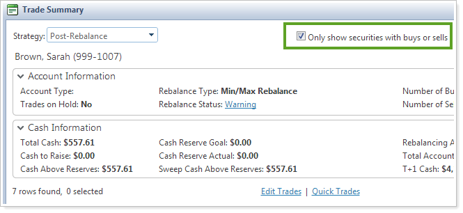 Advisor Rebalancing will now remember the setting for Only show securities with buys or sells on the Trade Summary page. For example, if you clear this check box, the check box will be cleared next time you visit the Trade Summary page.