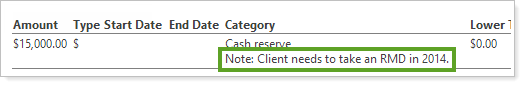 Many of you add notes to cash reserves that you want others to see – for example, you may want to let another advisor know the specific date for an RMD distribution. With this release, you can see the notes you've added for cash reserves when you: