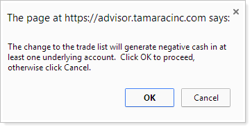 Many of you have requested the ability to perform a custom strategy for Rebalancing Groups when one of the underlying accounts starts or ends with negative cash or a value of $0.00. In this release, we've updated the logic so you can perform a custom strategy on any account with negative cash or a zero value. When you generate a custom strategy for an account or group that will finish with negative cash as a result of the trades, a dialog will appear that allows you to execute the trades, if desired.