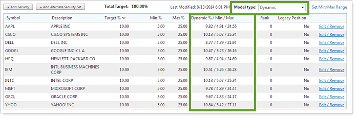 For example, let's say you have a momentum investing strategy and your target weights to track the performance of the securities in the model. This feature allows the model targets to adjust based on security pricing; however, you'll still be notified of any major changes in tolerance, such as an advisor liquidating a security that's assigned to the model.
