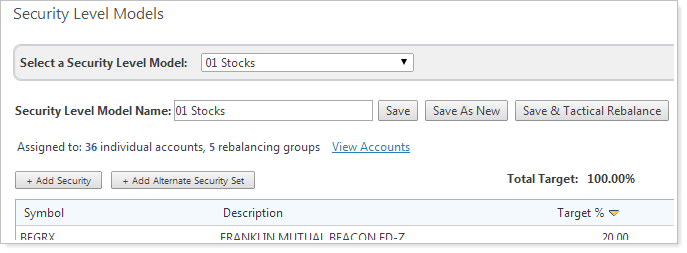 In order to view the accounts that the tactical rebalance will affect, the Security Level Models and Allocation Models pages now show the number of accounts the model is assigned to.