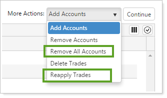 Reapply TradesAllows you to save and rebalance all of the accounts assigned to a directed trade, so you won't have to complete a directed trade and then later rebalance the same accounts. If you change the details of the directed trade, the Reapply Trades option reapplies the directed trade to all accounts within the trade, not just those accounts that have changes. This option will always apply the trade to all accounts whether changes have been made to the trade or not.