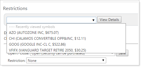 Often you search for the same security in multiple places. For example, you may search for the security VFIFX on the Rebalance Summary page and then search for it again on the Security Restrictions page. To save you a little extra time, the 10 most recently viewed symbols will now appear in the Symbol drop-down lists. This change should make it a little faster to find the symbol you want to look up.