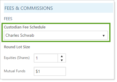 Your custodian or custodians will tell you about the transaction fees they charge for certain mutual funds. Once you have this information, you can set up these fees for each custodian on the Custodian Transaction Fee section of the Fee Schedules page.