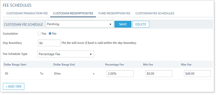 Pershing has informed you that they charge a redemption fee of 2% for selling out of a position within 90 days, with a maximum fee of $49.95. On Custodian Redemption Fee, you set up the redemption fee for Pershing accordingly.