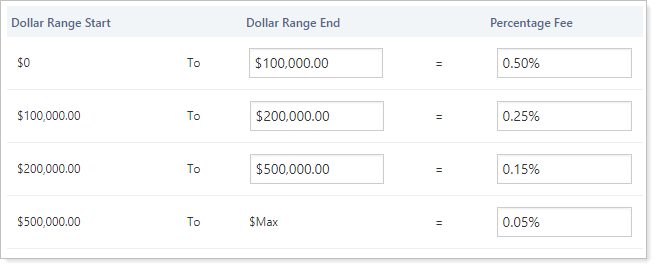 If your fee schedule is cumulative, the fees charged will be based on the tiers of the fee schedule. If the amount of the transaction is more than the lowest tier, the fees will first be charged up to that dollar amount, then any amount over will be charged at the second tier rate, and so on.