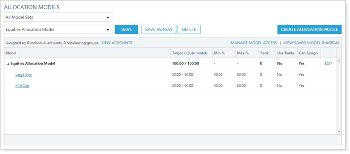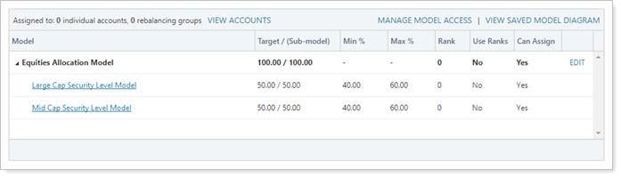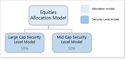 In this example, you've created Equities Allocation Model and added two submodels, both of which are Security Level models: Large Cap Security Level Model and Mid Cap Security Level Model.