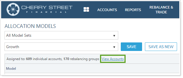 You can view a list of accounts assigned to a particular Allocation model directly on the Allocation Models page. To view accounts assigned to an Allocation model, follow these steps: