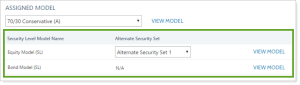 This alternate security set can be assigned to accounts under $100,000 on the Model Assignment panel. For more information, see Security Level Model Name/Alternate Security Set Settings.