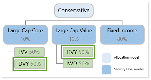 A new account is assigned to Conservative and is uploaded with an allocation of 12% to DVY. The initial allocation will be split by 50%, allocating 6% to Large Cap Core and 6% to Large Cap Value.