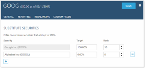 Substitute and Equivalent Securities.Substitutes allow you to assign similar replacement securities in your Security Level models. For example, you can provide an alternative fund for a mutual fund which is closed to new investors. For more details, see Substitute and Equivalent Securities in Models.