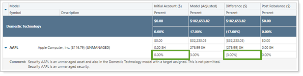 Unmanaged securities within models must have a 0% target. If you set a greater target than 0, the account won't rebalance.