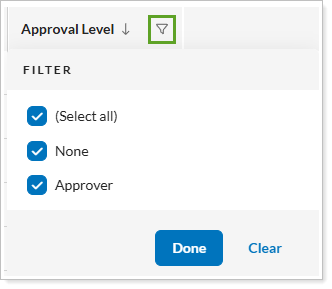 on the Approval Level column. Select the values to narrow the list.