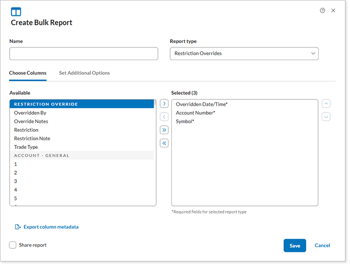 Restriction Override Columns Section.You can add restriction override details to other bulk reports, such as the Account Information bulk report, to view various restriction override data points.