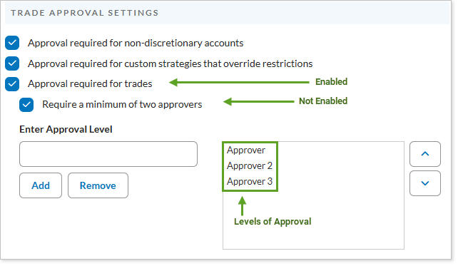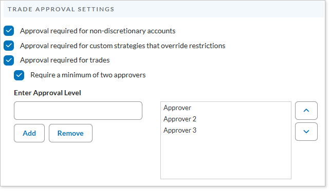 If you enable Require a minimum of two approvers, at least two approvals will be required before a trade can go to the Trade List, one of which must be from a user with the highest level of approval.